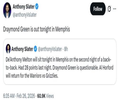 除此之外,追夢(mèng)也在賽前突然因傷缺席,勇士隨隊(duì)記者Anthony Slater給出的原因是左下背部傷病管理。