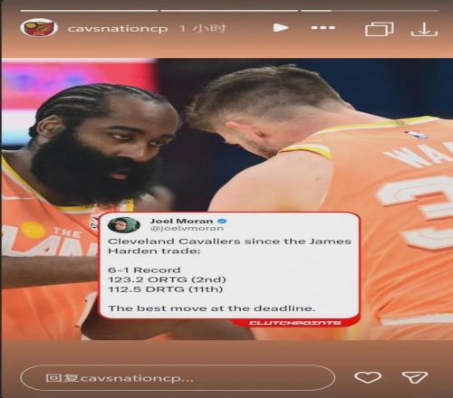 目前為止,哈登為騎士出戰(zhàn)七場(chǎng)比賽,場(chǎng)均上陣32.1分鐘,貢獻(xiàn)18.9分4.6板8助,三項(xiàng)命中率49.4%、48.8%和86.7%,期間球隊(duì)6勝1負(fù)、進(jìn)攻效率123.2聯(lián)盟第二,以及防守效率112.5聯(lián)盟第11,雙方的合作被公認(rèn)為今年交易截止日前的最佳操作。