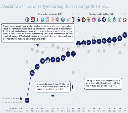 從歷史維度看,2025年報告的巨額稅前利潤和虧損中,僅有兩個案例能進入歷史前30名。這表明,盡管部分俱樂部的盈虧數(shù)額巨大,但在歐洲足球財務(wù)史上仍有更為極端的先例。