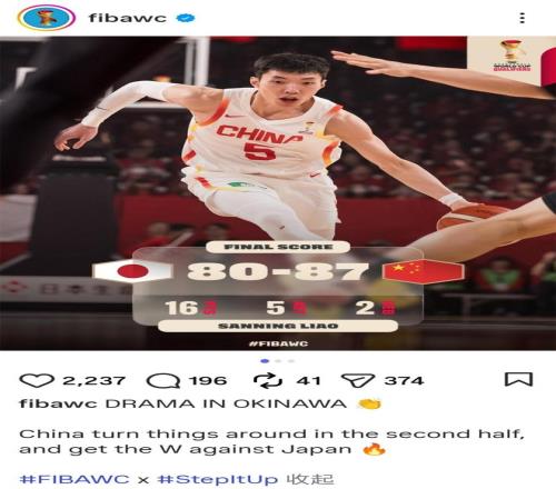 賽后,FIBA(國際籃球聯合會)世界杯社交媒體官方賬號寫道:“沖繩神劇本!中國男籃從日本偷走一場勝利。”(China with a sneaky win over Japan),“Sneaky”一詞隱含“鬼祟、卑鄙”的貶義,被質疑暗指中國隊勝之不武,引發全球球迷強烈不滿。