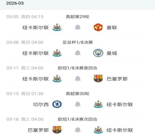 這也意味著,即將到來的3月份,紐卡斯?fàn)枌⒂瓉沓壞Ч淼馁惓獭?月5日到18日這短短的14天時間內(nèi),他們需要連踢5場比賽,而且這5場比賽沒有一場是輕松的。