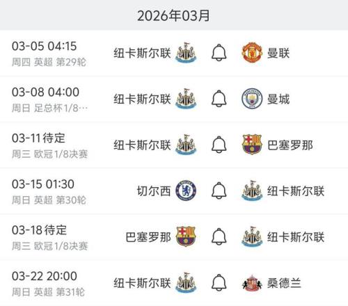 紐卡將在兩周時間里連續迎戰曼市雙雄、切爾西,并進行與巴薩的兩回合歐冠較量。3月最后一場比賽里,他們將在主場迎來東北德比對手桑德蘭。
