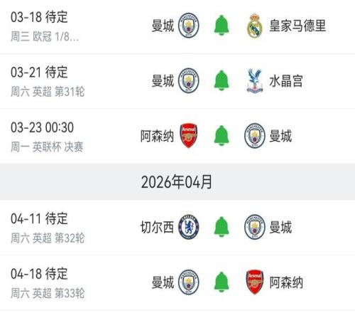 另外,曼城還將迎來魔鬼賽程,3月下旬開始,他們要先迎來主場對陣皇馬的次回合比賽,接著參加對陣阿森納的英聯(lián)杯決賽,國際比賽日后,他們將在客場迎戰(zhàn)切爾西,又在主場迎戰(zhàn)阿森納。