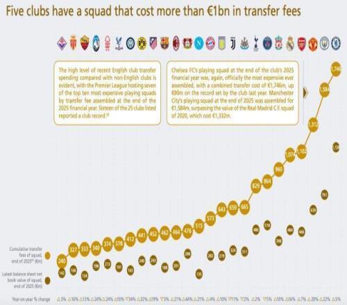 歐洲足壇目前共有5家10億俱樂部,英超占2025財年末身價排名前10的球隊中的7支。上榜的25家俱樂部中有16家刷新了俱樂部歷史最高紀錄。切爾西在2025財年末的陣容身價再次創下新高,總轉會費高達17.46億歐元,比他們去年創下的紀錄高出9000萬。