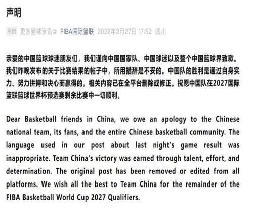 今天,F(xiàn)IBA國際籃聯(lián)官方終于頂不住壓力,發(fā)表聲明,因昨日中國男籃戰(zhàn)勝日本男籃的比賽結果帖子中的措辭不當,而向中國男籃、中國球迷以及整個中國籃球界致歉,以下為原文: