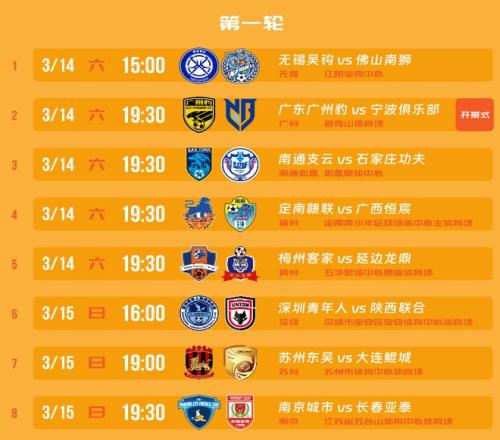 3月15日將展開首輪其他3場較量:明顯補強,具備沖超實力的深圳青年人,將與另一支沖超熱門陜西聯合上演遭遇戰。另外,蘇州東吳與大連鯤城展開對話,另一支江蘇球隊南京城市,則與剛降到中甲的長春亞泰狹路相逢。