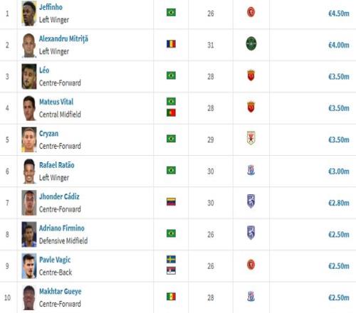 升班馬遼寧鐵人則以1301萬歐元排名第5位,熱菲尼奧以450萬歐元的身價成為中超身價最高的球員,力壓米特里策(400萬)以及身價達到350萬的維塔爾、克雷桑、萊昂納多。