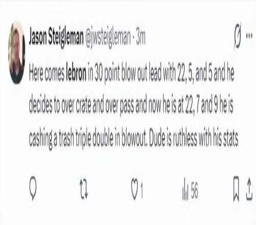 這場比賽美記Jason Steigleman寫道:勒布朗在湖人領先30分時還登場,當時他的數據是22+5+5,他還是決定登場刷數據,他希望在一場大比分領先的情況下刷三雙,這家伙真是對數據非常癡迷。