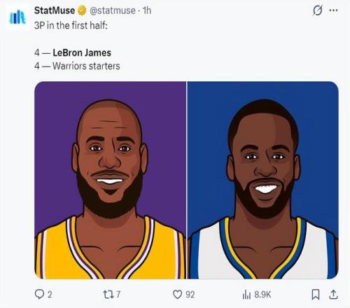 整個上半場湖人能大比分領先勇士,詹姆斯肯定是第一功勞,上半場詹姆斯17分鐘,10中7,三分4中4,拿到20分4籃板4助攻1搶斷,命中率70%,三分命中率100%,真實命中率88.3%,他一人命中4個三分,勇士先發5人合計4個三分。