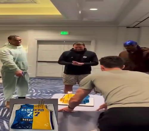 之后,湖人工作人員為東契奇送上了斯洛文尼亞國家隊的球衣和湖人球衣拼接樣式的蛋糕。