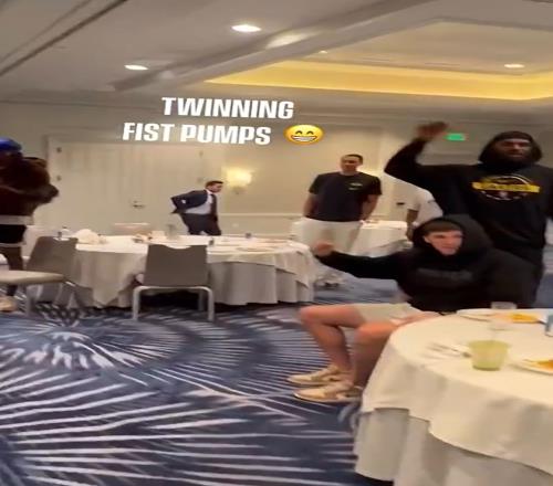 海斯和范德比爾特站在東契奇一旁,像兩大護法一般,拉拉東契奇的帽子,拍拍他的肩膀,欺負人!
