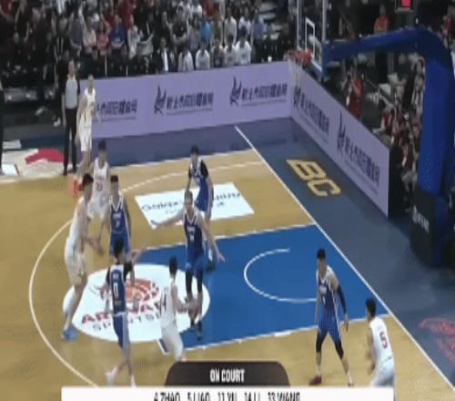 第一節末段,雙方打的十分膠著,廖三寧、高詩巖連續上場強突。——廖三寧上到籃下后,傳球給到朱俊龍,后者遠投三分命中。漂亮!