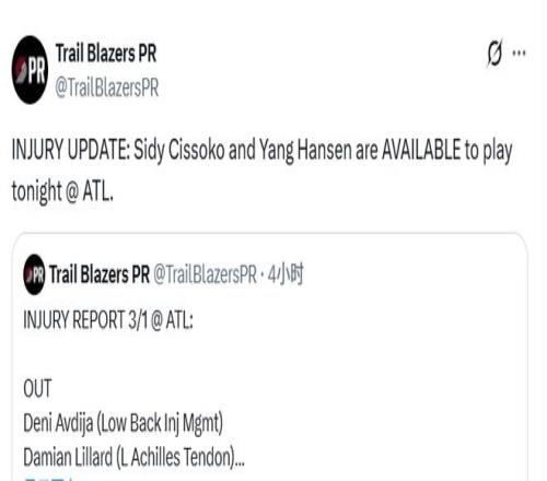 北京時間3月2日,開拓者客場對陣?yán)销棧@是他們背靠背的第二場比賽,昨日客場對陣黃蜂的比賽,開拓者93-109輸?shù)舯荣悾瑮铄蛄俗詈?分15秒,得到2分1籃板。今天的比賽前,楊瀚森雖然一度因背部酸痛被列為出戰(zhàn)成疑,但賽前官方更新傷病名單,還是顯示他被激活了,可以出戰(zhàn)。阿夫迪亞、夏普和羅威本場缺陣。