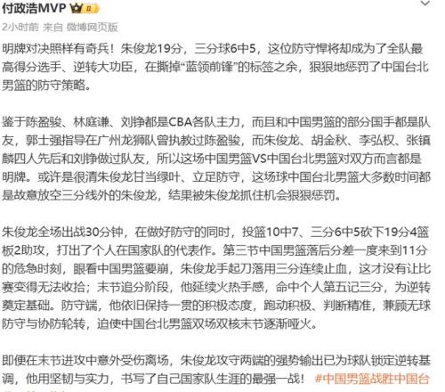 此役,擔任中國隊首發小前鋒的朱俊龍表現堪稱卓越,上場奮戰30分鐘,投籃10中7球,三分球6投5中,砍下全隊最高的19分、4個籃板以及2次助攻,在中國隊落后階段多次命中底角三分幫助球隊渡過難關,如同定海神針,幫助球隊最終逆轉臺北,賽后朱俊龍也獲得了球迷的高度好評,不少球迷和媒體人都將他評為中國隊本場比賽的MVP。