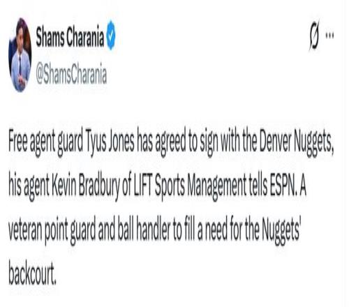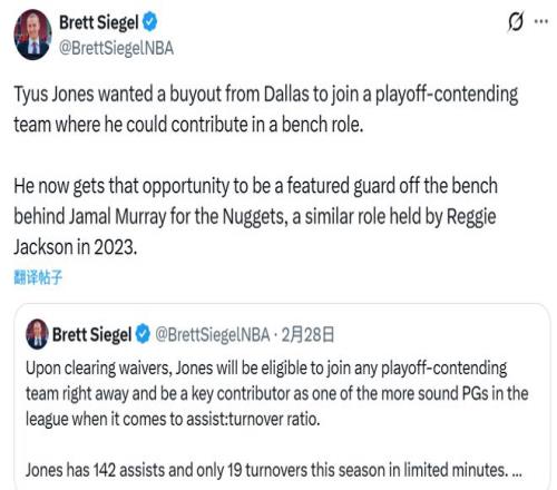 名記Siegel跟進(jìn)報(bào)道稱,瓊斯與獨(dú)行俠達(dá)成買斷,是想加盟一支具備季后賽競(jìng)爭力的球隊(duì),并在球隊(duì)中擔(dān)任替補(bǔ)貢獻(xiàn)者。如今他得到了這樣的機(jī)會(huì) —— 將在掘金擔(dān)任賈馬爾-穆雷身后的主要替補(bǔ)后衛(wèi),這與2023年雷吉-杰克遜在掘金的角色相似。