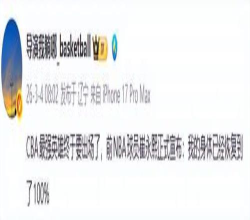 根據著名媒體人導演我躺哪報道,這位曾在NBA夏季聯賽嶄露頭角的年輕鋒線,通過個人社交媒體正式宣布:“我的身體已經恢復到了100%。”短短一句話,就像一顆投入湖面的巨石,瞬間在籃球圈激起千層浪。而更讓球迷熱血沸騰的是,他的復出首秀,就要對陣聯賽中的勁旅新疆隊。