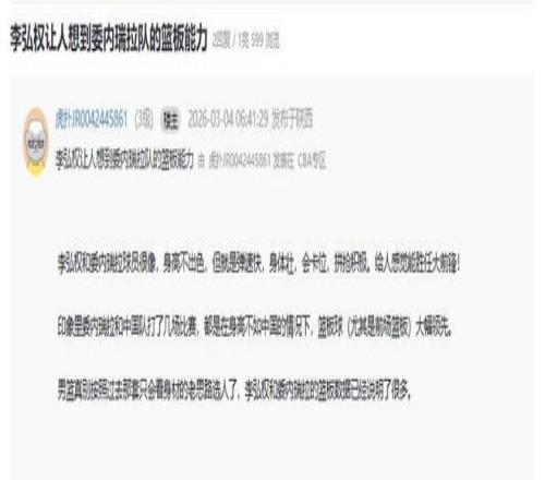 球迷們更是分析了李弘權現象,希望中國隊員甚至所有CBA球員能從李弘權身上學點什么。球迷分析道:李弘權和委內瑞拉球員很像,身高不出色,但就是彈速快,身體壯,會卡位,拼搶積極。給人感覺能勝任大前鋒!印象里委內瑞拉和中國隊打了幾場比賽,都是在身高不如中國的情況下,籃板球(尤其是前場籃板)大幅領先。男籃真別按照過去那套只會看身材的老思路選人了,李弘權和委內瑞拉的籃板數據已經說明了很多。