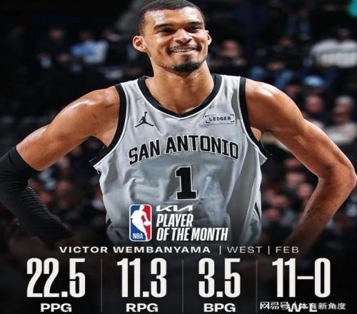 先來說說最佳球員,文班亞馬在單月里場均能砍下22.5分,摘下11.3個籃板,還能送出3.5次蓋帽,在他的助力下,球隊取得了11勝0績。這是文班亞馬職業生涯中首次榮膺月最佳球員,相信有了這“第一次”的鋪墊,未來他必將多次斬獲此項榮譽。