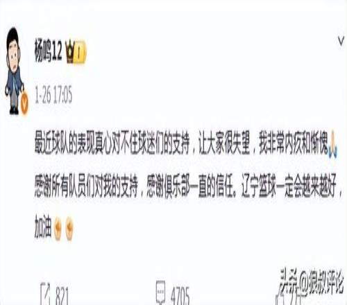 楊鳴當時更新社媒發文表示:最近球隊的表現真心對不住球迷們的支持,讓大家很失望,我非常內疚和慚愧,感謝所有隊員們對我的支持,感謝俱樂部一直的信任。遼寧籃球一定會越來越好。