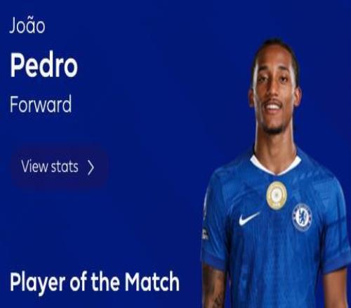 此役客場對陣維拉,在切爾西0-1落后的情況下,若昂-佩德羅上演英超生涯首次帽子戲法,并助攻帕爾默打入一球,幫助切爾西4-1逆轉取勝。
