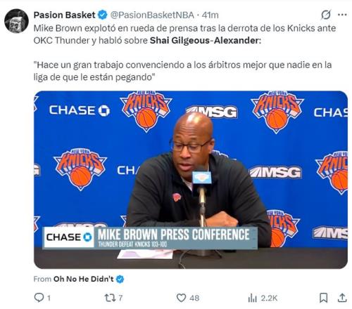 賽后邁克-布朗這樣評價SGA:他在讓裁判相信他造犯規成功這個方面的確非常出色,聯盟里沒有人能比得過他。(嘲諷亞歷山大是碰瓷王、罰球王)