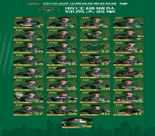 中場:4-樸鎮燮、6-鮑盛鑫、8-錢杰給、10-托利奇、13-麻皓齊、14-吳偉、19-阿布、22-程進、28-米特里策、29-張佳祺、37-葉道鑫、41-姜宇軒