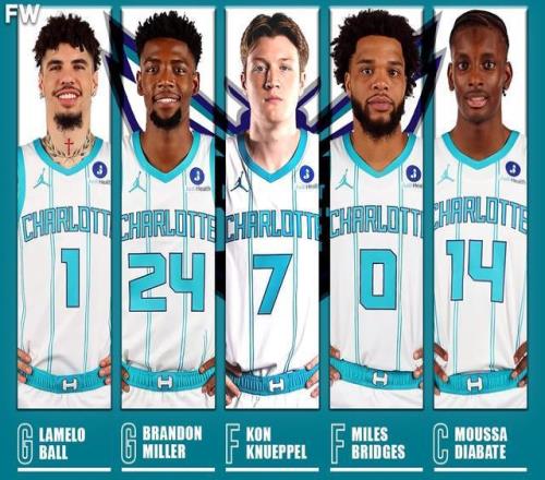 賽季初,黃蜂4勝13負開局,大家都以為他們又要俯沖搶狀元了。結(jié)果等首發(fā)陣容湊齊后,風(fēng)向全變了。 由三球(LaMelo Ball)、米勒、克努佩爾、橋橋(Miles Bridges)和迪亞巴特組成的首發(fā)五虎,本賽季合體出戰(zhàn)31場,戰(zhàn)績是驚人的28勝3負! 這套陣容的進攻效率高達134.9。簡單來說,只要這五個人在場,黃蜂就是在用激光槍打別人的冷兵器。
