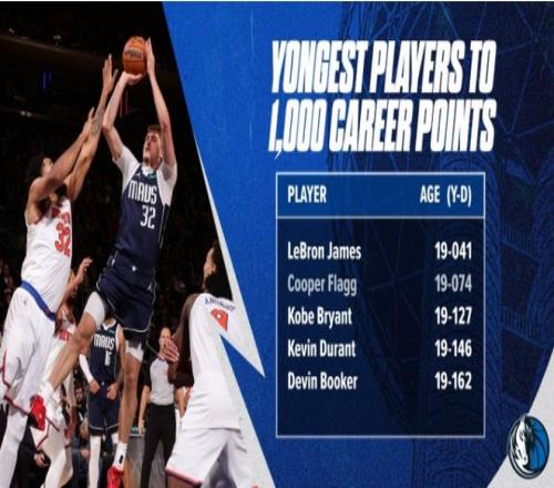 弗拉格因傷缺席8場后復出,他達成生涯1000分里程碑,且只有19歲74天創歷史第二年輕紀錄,僅次于詹姆斯19歲41天,超越科比19歲127天、杜蘭特19歲146天、布克19歲162天。