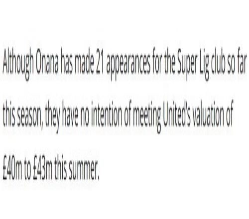 特拉布宗體育租借奧納納的合同中,并沒有任何買斷選項(xiàng)或者強(qiáng)制性義務(wù),要想完成轉(zhuǎn)會,就必須與曼聯(lián)談妥轉(zhuǎn)會費(fèi)。然而,雙方在價格上的差異相差太大。