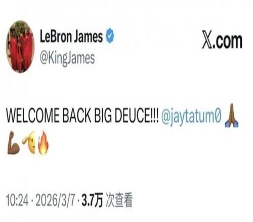 遠在洛杉磯的湖人球星詹姆斯也特意發文,向這位年輕球星送上祝福:“歡迎回歸,大 Deuce!@塔圖姆 ”,敬意與鼓勵溢于言表。