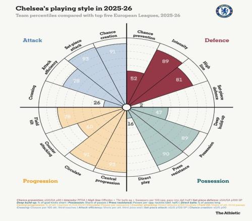 The Athletic最新更新的比賽風格分布圖有助于將這一弱點置于背景中。雖然我們可以看到切爾西是一支強大的控球型球隊,在馬雷斯卡和羅塞尼爾指導下能夠很好地傳導球以創(chuàng)造高質量機會,但在防守定位球方面,他們發(fā)現自己處于歐洲五大聯賽所有球隊中墊底的2%之列。