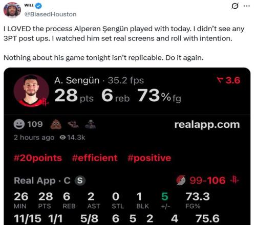 賽后火箭媒體人BiasedHouston一針見血的指出:“我喜歡今晚申京打球的方式,他徹底放棄了三分線外背身單,而是專注于認真地進行掩護,然后有目的地順下,這是可以復制的成功模式”