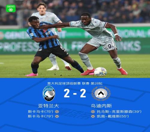 北京時間3月8日意大利足球甲級聯賽第28輪,亞特蘭大主場迎戰烏迪內斯。上半場克里斯滕森頭球首開記錄,下半場戴維斯破門擴大比分,斯卡馬卡5分鐘內連進兩球幫助亞特蘭大扳平比分,最終雙方2-2握手言和。