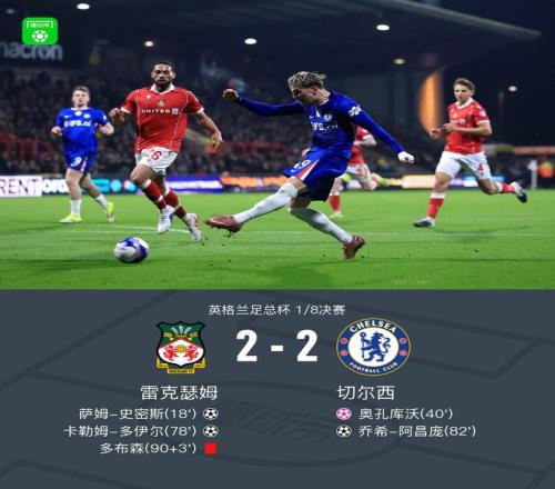 北京時間3月8日英格蘭足總杯 1/8決賽,雷克瑟姆對陣切爾西。上半場,史密斯單刀破門,加納喬打門造烏龍。下半場,多伊爾腳后跟破門,隨后,阿昌龐爆射破門,再次扳平。常規時間比分雷克瑟姆 2-2 切爾西。
