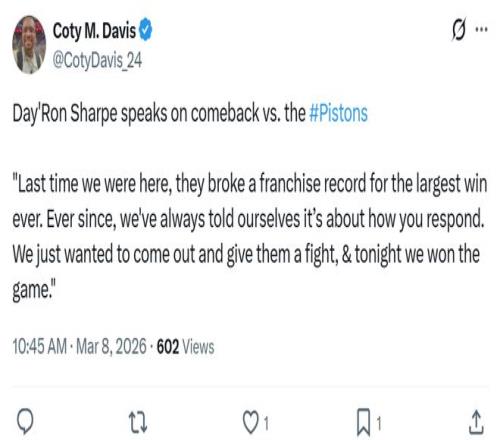 賽后籃網內線夏普就表示:“上次我們來到這里時,活塞贏了53分創造隊史最大分差,從那時起我們就一直告訴自己,關鍵不是輸多少分,而是看你如何回應,我們就是想從跌倒的地方爬起來和他們拼一場。”
