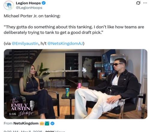 賽后他也公開炮轟本賽季聯盟風行的擺爛行為:“聯盟得對這種擺爛行為做點什么了,我很討厭一些球隊為了拿到更好的簽位故意擺爛輸球?!?/p>