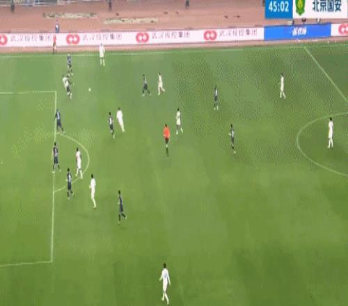 北京國安始終占據比賽主動,不斷創造出破門機會。比賽的第45分鐘,塞爾吉尼奧直塞,王剛底線回傳,法比奧頭球沖頂破門,1比0!