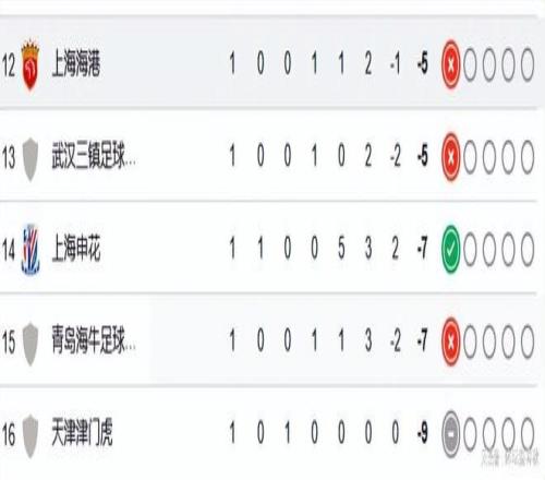 最后再來看一下積分榜榜尾的情況,天津津門虎本輪主場0-0戰(zhàn)平重慶銅梁龍,目前積-9分排名倒數(shù)第一。青島海??蛨?-3完敗云南玉昆,仍是-7分。目前上海申花也是-7分,因為凈勝球的關系海牛排名倒數(shù)第二。而這3支球隊即便是后邊兩輪聯(lián)賽全部取勝,仍然無法將負分變正。