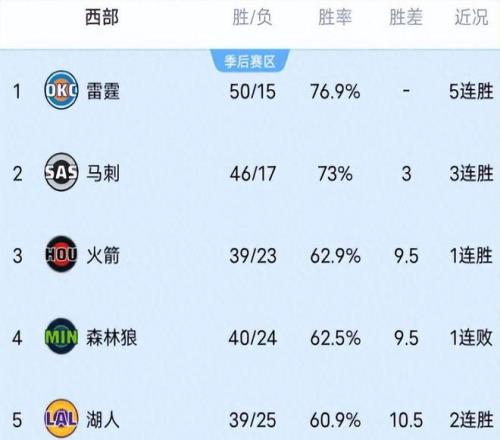 當前前六格局已然清晰:雷霆高居榜首,馬刺穩守第二,火箭、森林狼、掘金、湖人四隊纏斗不休,彼此間勝場差微乎其微,每一場對決都有可能重塑整個季后賽生態。