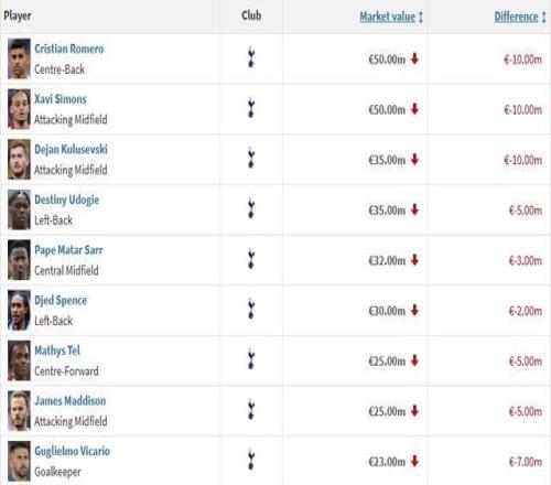 北京時間3月9日,德轉更新了英超聯賽球員的身價,熱刺一共有17人身價有變化,其中16人下跌,羅梅羅、哈維-西蒙斯和庫盧塞夫斯基均下跌1000萬歐元,僅有小將索薩上漲了700萬歐。
