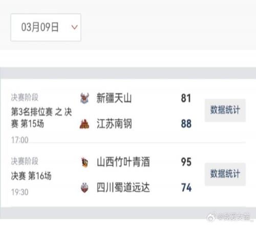 新疆天山 81-88 江蘇南鋼,江蘇女籃三人得分上雙,孫宇25分7籃板,許晨妍22分11籃板,王馨雨16分5籃板。新疆女籃四人得分上雙,武桐桐31分8助攻,王雪朦20分5籃板,耿夢君12分,張慈源10分。
