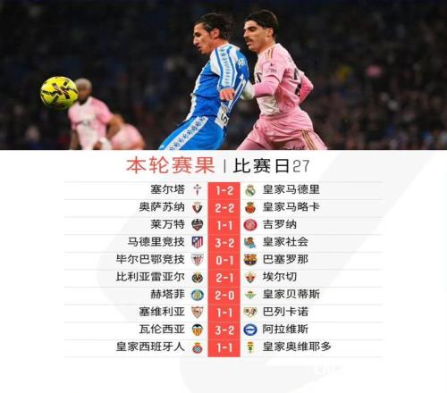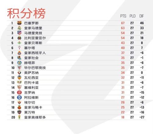 北京時間3月10日凌晨,西班牙人主場1比1戰平皇家奧維耶多后,西甲第27輪十場比賽全部戰罷。積分榜方面,本輪“皇薩競”全部贏球:皇馬客場2比1擊敗塞爾塔,巴薩同為客場1比0擊敗畢爾巴鄂競技,馬競則是主場3比2力克皇家社會。目前,巴薩積67分繼續領跑,皇馬積63分排名第二,馬競積54分。比利亞雷亞爾同樣贏球,積分繼續與馬競持平,僅以凈勝球劣勢排名第四。皇家貝蒂斯客負赫塔費,積43分位列歐聯區,塞爾塔輸球積40分位列第六。