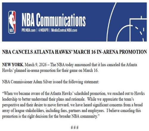 NBA總裁蕭華發表如下聲明:“當我們得知亞特蘭大老鷹隊的場內推廣計劃后,立即與球隊管理層取得聯系,以更好地了解他們的計劃和理由。盡管我們理解球隊的立場以及他們向前推進的意愿,但我們也聽到了來自聯盟廣泛利益相關方(包括球迷、合作伙伴和員工)的重大關切。我相信,取消這項推廣活動,對于更廣泛的NBA社區而言是正確的決定。”