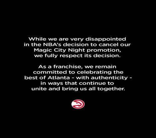 隨后老鷹官方發表聲明:“盡管我們對 NBA取消這一推廣活動的決定感到非常失望,但我們完全尊重聯盟的決定。作為一支球隊,我們將始終致力于以真誠的方式致敬亞特蘭大最優秀的文化,繼續用能讓大家團結在一起、凝聚彼此的方式前行。”