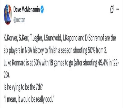 另外,NBA歷史上目前只有6位曾經單賽季三分命中率達到至少50%的球員。他們是科沃爾、科爾、萊格勒、桑德沃爾德、卡波諾、施拉姆夫。肯納德目前三分命中率50%,本賽季還剩18場比賽(他2022?23賽季命中率為 49.4%)。他會成為歷史第 7 人嗎?