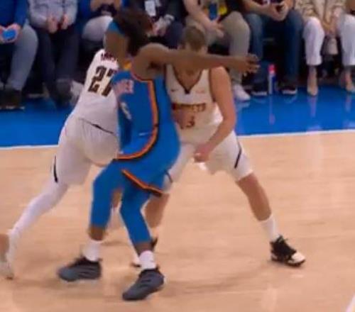 今日掘金客場再戰雷霆,比賽進行到還剩下1分鐘左右時,以116比123落后的掘金發動進攻。約基奇上提為穆雷設置掩護,多爾特在擠過掩護的過程中,左手手肘向后甩動,結結實實地打在了約基奇的面門上。再度遭到多爾特襲擊的約基奇捂臉倒地。裁判在觀看了回放之后,將這次犯規升級成為了一級惡意。