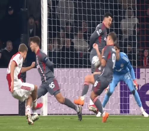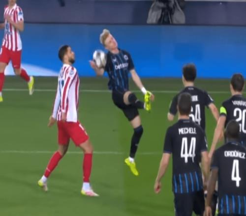 歐冠附加賽的案例已經印證了這一點。例如,布魯日球員華金?塞斯在對陣馬競的比賽中,盡管背對來球,皮球仍擊中他的手臂,VAR 回看后被判點球。歐足聯認定塞斯的右臂處于“非自然姿勢、遠離身體”。同樣的表述也出現在奧林匹亞科斯球員穆扎基蒂斯客場對陣阿賈克斯的歐冠小組賽中 —— 球員封堵射門,VAR推翻了主裁原本不判點球的決定。
