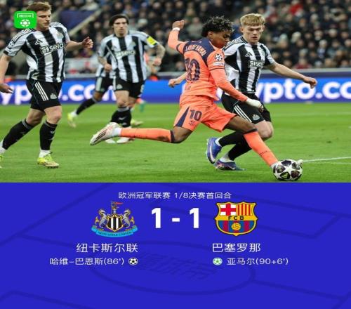 北京時間3月11日歐洲冠軍聯賽 1/8決賽首回合,紐卡斯爾聯對陣巴塞羅那。紐卡斯爾聯哈維-巴恩斯破門。巴塞羅那亞馬爾破門。最終比分紐卡斯爾聯 1-1 巴薩。