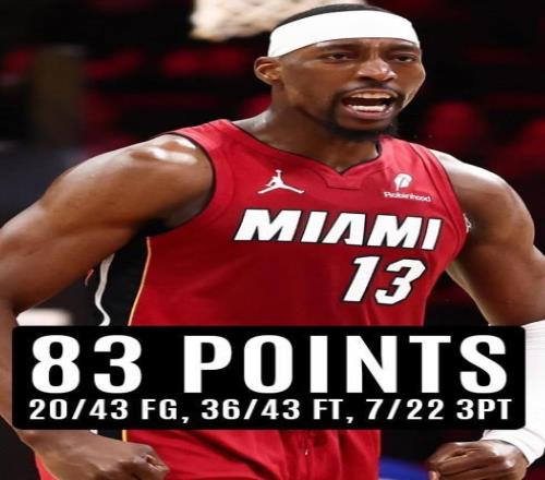 下半場比賽,阿德巴約繼續自己神奇演出,第三節再砍19分后,阿德巴約前三節累計得分達到62分,這不僅讓他超越了詹姆斯的61分成為熱火隊史得分王,更讓他追平了科比保持的前三節得分紀錄。最后一節比賽,在球隊大比分領先的情況下,熱火全隊開始有意識地為阿德巴約做球。最終,通過一次次罰球,他的得分定格在83分,正式超越了那個被視作現代籃球得分天花板的數字(81分)。