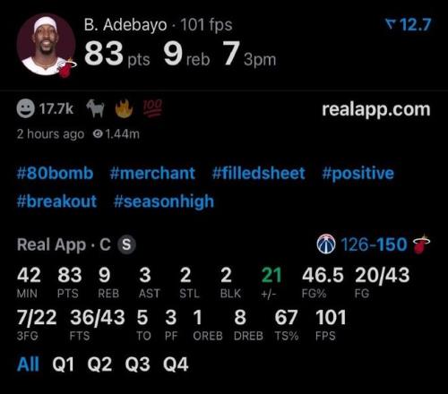 次節阿德巴約得分繼續上雙,半場結束時已得到43分,打破詹姆斯保持的熱火隊史半場紀錄(37分)。